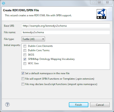 Here is how to convert the kennedys ontology into schema.org with TopBraid Composer and SPINMap. SPINMap is a powerful rule-based transformation language with a graphical notation that can be used to create target RDF triples from a collection of source instances. As the first step, we create an empty RDF file called schemakennedys that imports schema.org. Then we create a new SPIN file that imports schemakennedys and the SPINMap namespace: